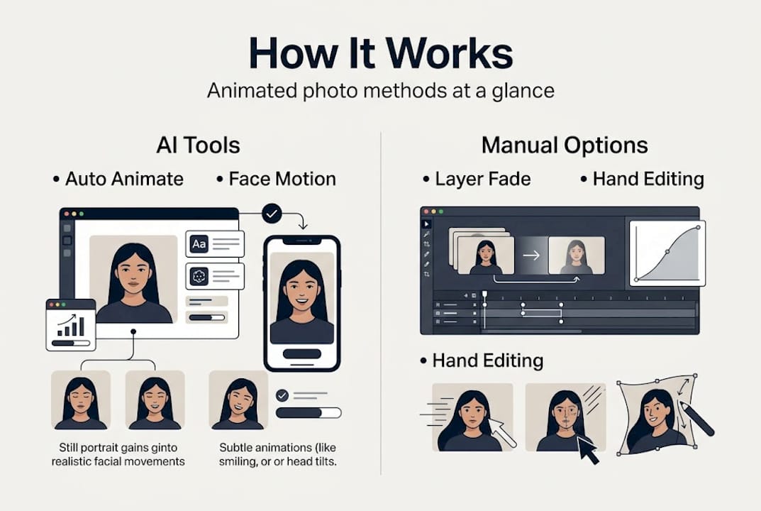Not all animated photo tools work the same way, and the right choice depends on what you want to create. Common methodologies include AI image-to-video tools like Runway Gen-3 and Kling AI, manual keyframing in Photoshop, cinemagraphs that animate only part of an image, and parallax effects that add a 3D depth illusion. Each has its own strengths for family use.
